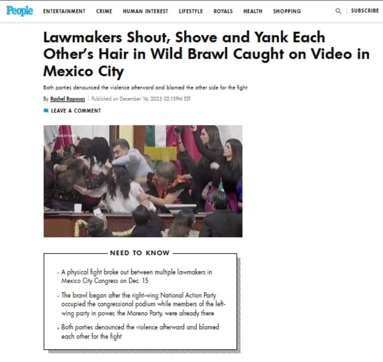A debate in Mexico City’s Congress turned into a hair-pulling brawl as lawmakers clashed over plans to shut down the city’s transparency institute, which oversees data protection and public access to information. pic.twitter.com/XkmuOWxdhj — DW News (@dwnews) December 16, 2025