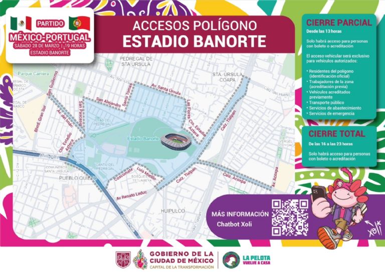 El ingreso peatonal será exclusivo para asistentes con boleto o habitantes que comprueben domicilio en el área.CIUDAD DE MÉXICO (apro).- El gobierno de la Ciudad de México aplicará cierres viales y restricciones a la circulación a partir de las 13:00 horas del sábado 28 de marzo en el perímetro del Estadio Banorte, con motivo del partido amistoso entre las selecciones de México y Portugal programado para las 19:00 horas.