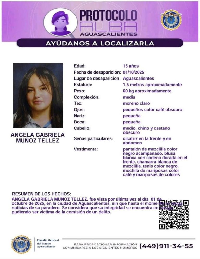 En días pasados también se registró la desaparición de Ángela Gabriela Muñoz Téllez, de 15 años, quien desapareció el 1 de octubre en la zona centro de la ciudad capital, donde trabajaba. Su familia se manifestó este miércoles en el Palacio Municipal de la capital aguascalentense para exigir su localización.