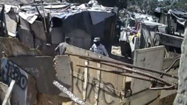 El presunto guardia es acompañado por otra persona, también de uniforme, gorra y chamarra negra, quien se mete a la vivienda elaborada con pedazos de cartón, lona y madera.