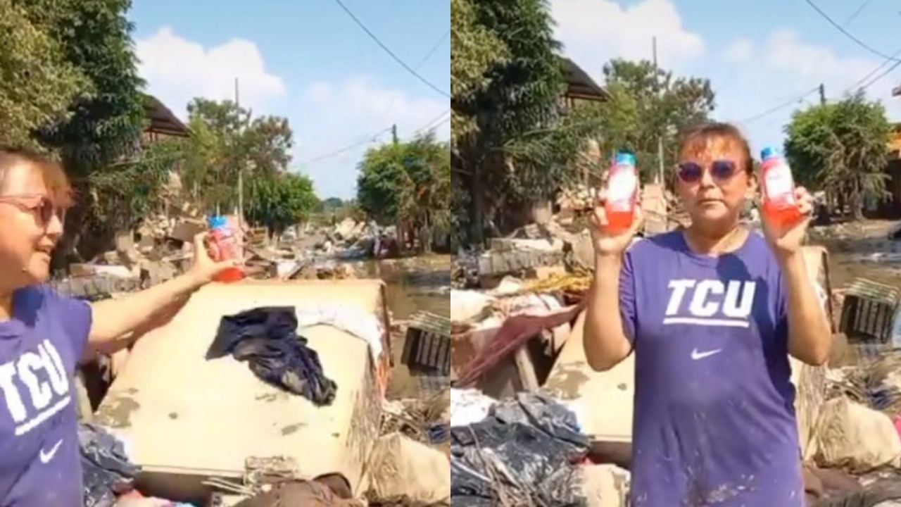 En un video difundido en redes sociales, un grupo de mujeres de Poza Rica aparece de pie frente a sus casas inundadas, sosteniendo botellas de suero, mientras una de ellas pronuncia en tono sarcástico: