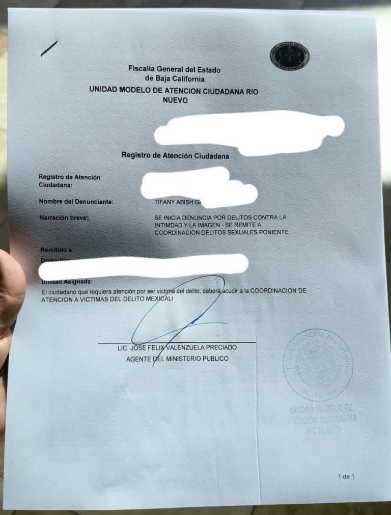 Tras presentar formalmente su denuncia ante la FGE, la comunicadora mexicalense, Tiffany Abish leyó un pronunciamiento para exponer la violencia que ha sufrido en el mundo digital, incluso desde su época de estudiante.