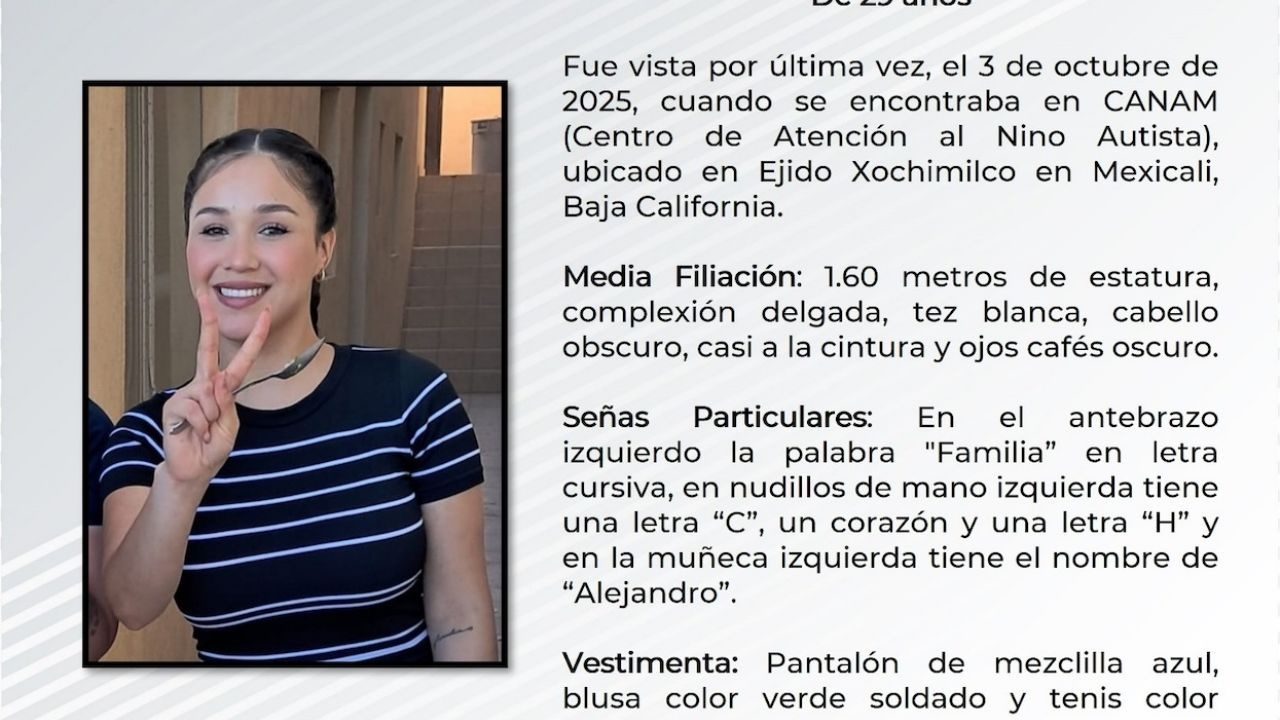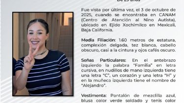 Conforme a los datos generales, Joseline fue vista por última vez cuando acudió al Centro de Atención al Niño Autista (Canam), ubicado en el Ejido Xochimilco de la capital bajacaliforniana.