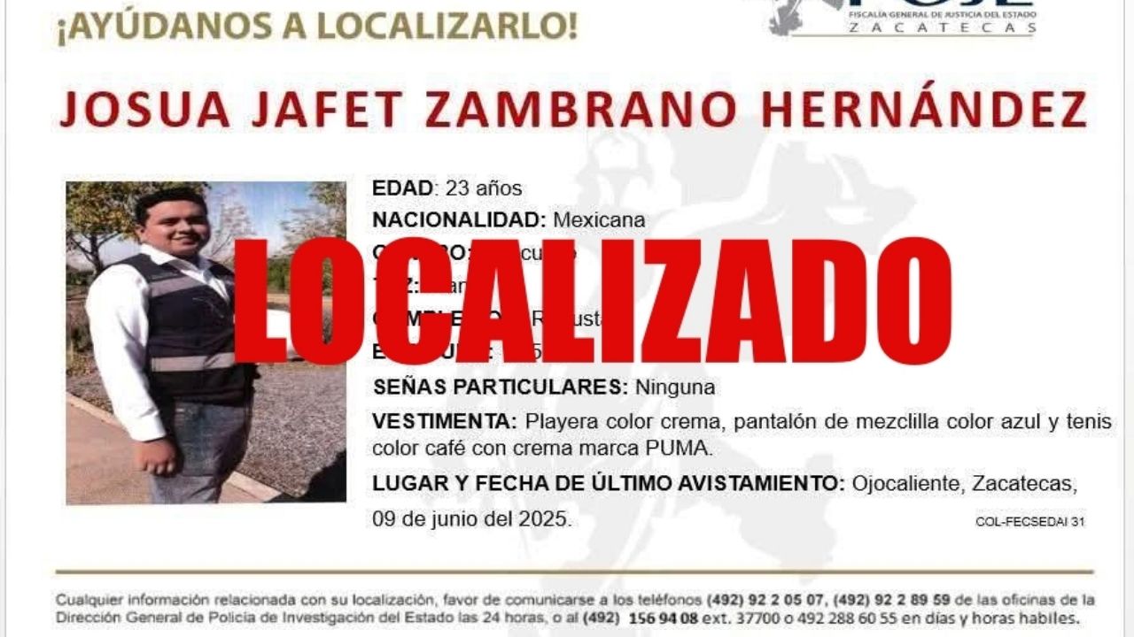 El joven de 23 años fue reportado como desaparecido el pasado 9 de junio en el municipio de Ojocaliente, donde gobierna su padre, el perredista Juan Manuel Zambrano Jiménez.