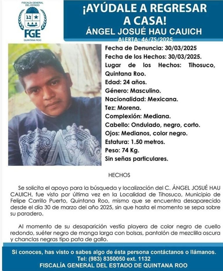 Tras la desaparición del joven de la comunidad de Tihosuco, su familia denunció la desaparición y se generó una ficha de búsqueda. Aunque Jacobo fue arrestado por este delito, se desconoce sí aportó más detalles del paradero de Ángel.