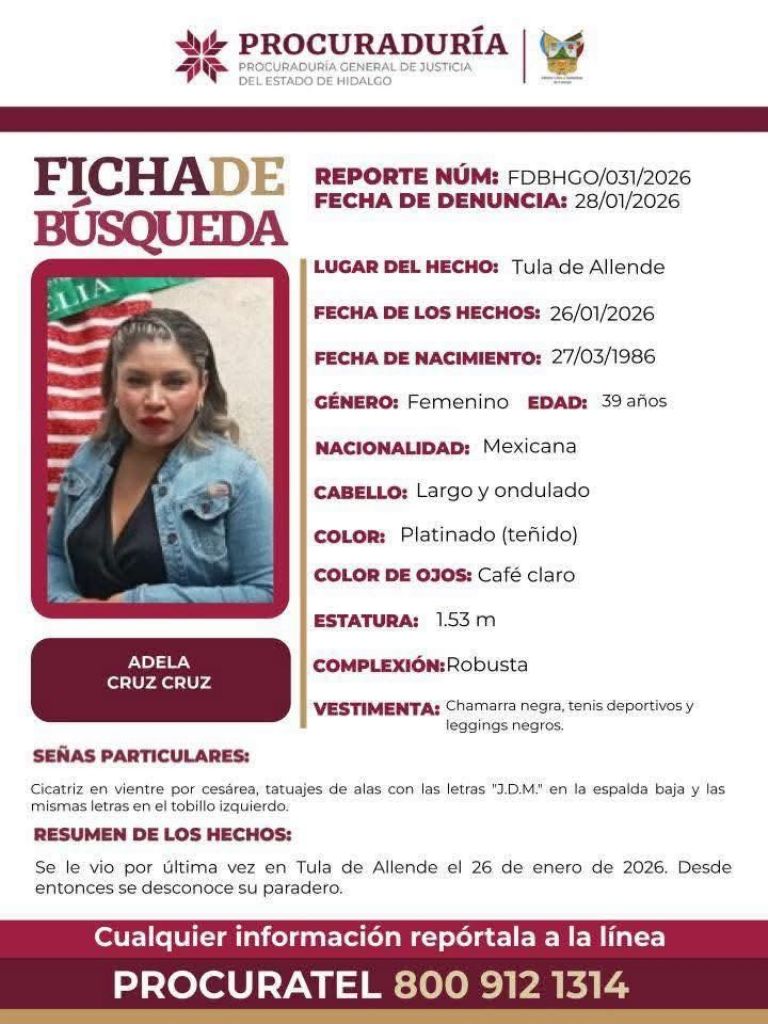 Adela había sido vista por última vez cerca del mediodía del lunes 26 de enero, camino a su casa en Bominhza, Tula.PACHUCA, Hgo. (apro).- El cuerpo sin vida de Adela Cruz Cruz, una mujer de 39 años que estaba reportada como desaparecida desde el 26 de enero, fue localizado ayer al fondo de un barranco en la comunidad de La Cañada, municipio de Atotonilco de Tula, Hidalgo.