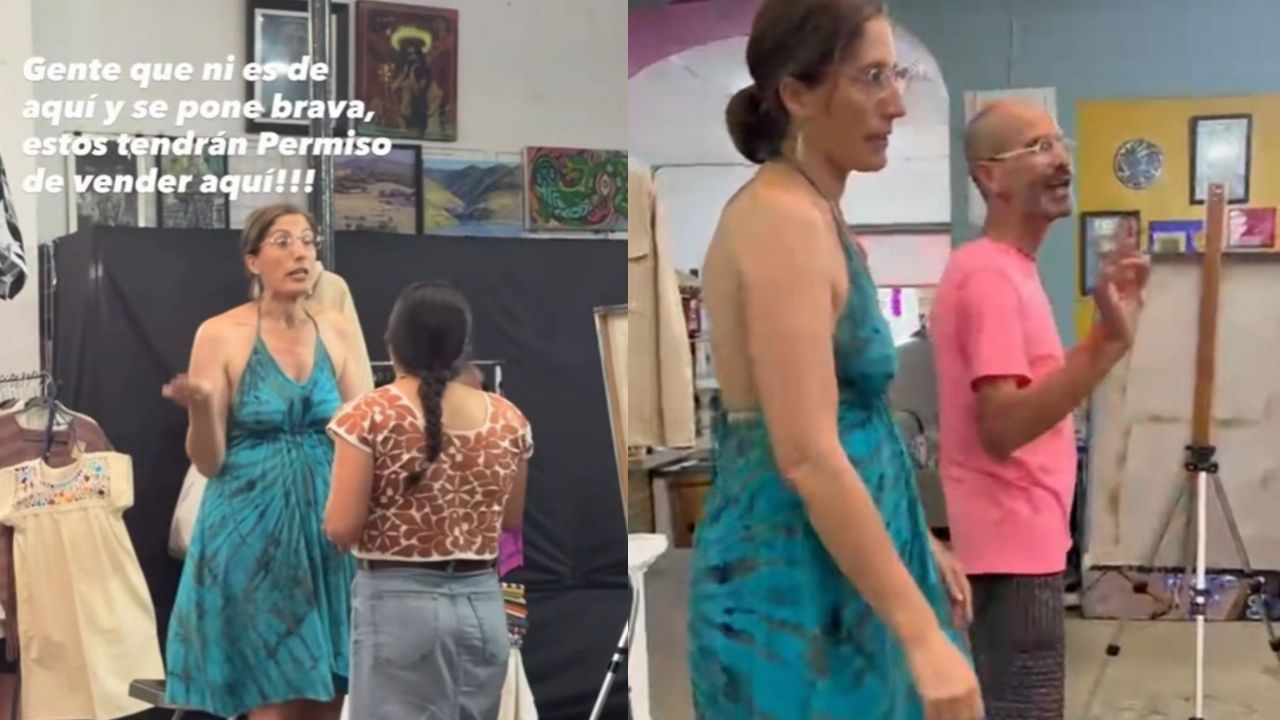 En la grabación se observa a un hombre y una mujer que expresan inconformidad por la música en el lugar y realizan comentarios dirigidos a las vendedoras. Durante el intercambio, ambos elevan el tono de voz frente a las artesanas.