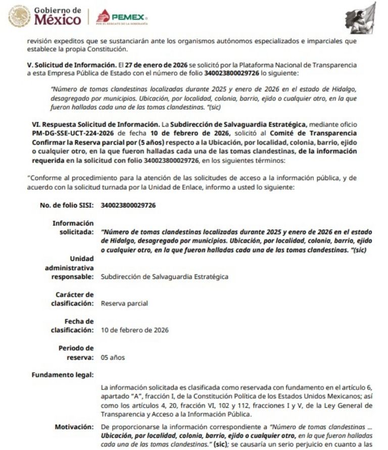 Al reservar, totalmente y por cinco años, la ubicación por localidad, colonia, barrio, ejido, o cualquier otro, donde fueron halladas cada una de las tomas clandestinas en Hidalgo durante 2025, Pemex reconoció que su red de ductos es considerada “una instalación estratégica que se encuentra permanentemente afectada por la incidencia en la ordeña de ductos”, lo cual “representa un problema con múltiples efectos desde daños a la infraestructura hasta afectaciones a la población y al medio ambiente”.