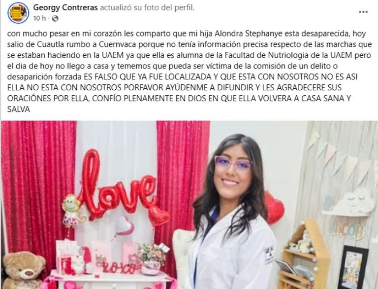 "Con mucho pesar en mi corazón les comparto que mi hija Alondra Stephanye está desaparecida. Hoy salió de Cuautla rumbo a Cuernavaca porque no tenía información precisa respecto de las marchas que se estaban haciendo en la UAEM, pero el día de hoy no llegó a casa y tememos que pueda ser víctima de la comisión de un delito o desaparición forzada”, publicó su madre en redes sociales.