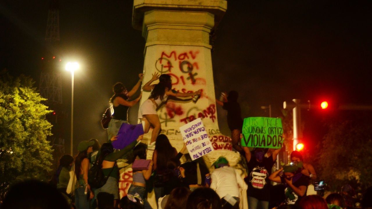 Tras tomar el monumento e izar la bandera de México con los colores feministas, realizaron intervenciones de iconoclasia para denunciar a los agresores y la violencia de Estado. Al mismo tiempo, al pie de las escalinatas, prendieron fuego a las pancartas que exhibían nombres de agresores de violencia de género, feminicida y sexual.