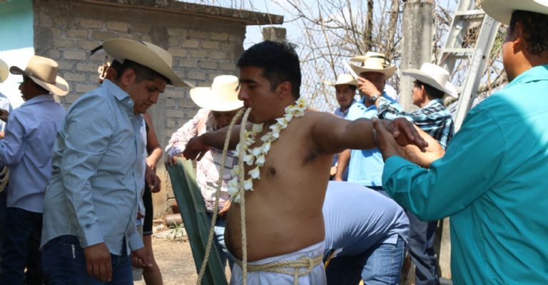 Señores del pueblo y familiares les colocan reatas de ixtle en los pies, que se entrecruzan en las piernas y terminan amarradas a la cintura.