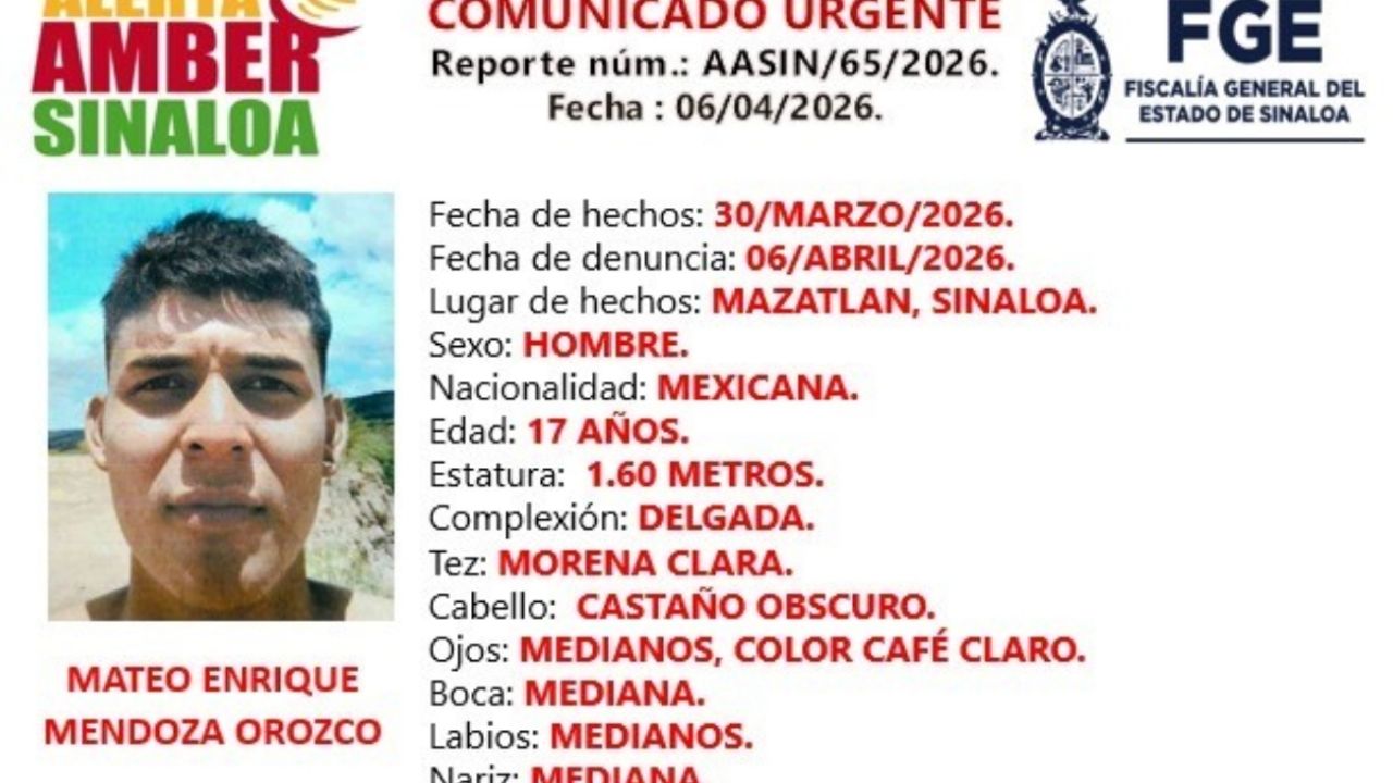 En Mazatlán hay antecedentes de jóvenes desaparecidos, como el caso de cuatro turistas de la CDMX en febrero último.CULIACÁN, Sin. (apro). - La Fiscalía General del Estado (FGE) activó una Alerta Amber por la desaparición del adolescente de 17 años Mateo Enrique Mendoza Orozco, originario de Torreón, Coahuila.