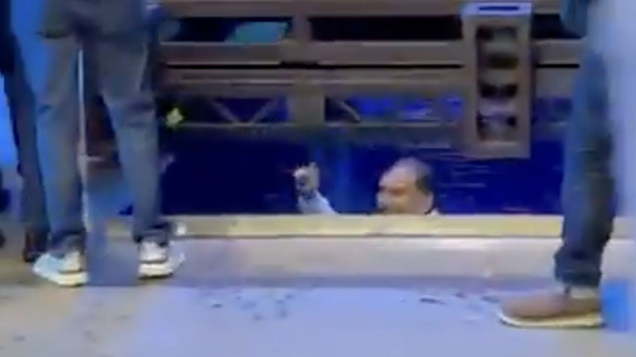 En redes sociales se viralizó un video del panista tropezando y cayendo hacia delante directamente a una pileta de agua que forma parte de la escenografía de la obra “Malinche”, que se presenta en dicho recinto.
