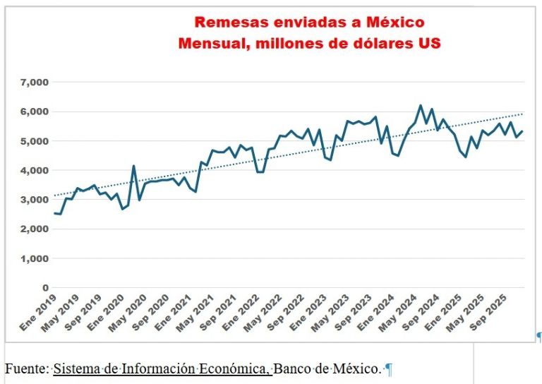 Este descenso estacional es inercial, presente cada año, como sucedió también en enero de 2025, cuando empezó el gobierno de Trump 2.0. La reducción de ese enero fue también muy sensible: 4.6 mil millones en ese mes, frente a 5.2 mil millones de diciembre de 2024. El mes de febrero de 2025, cabe añadirlo, continuó con el descenso, pues las remesas se ubicaron en 4.4 mil millones. Ese mes de febrero fue el piso del año: a partir de ahí comenzaron a recuperarse progresivamente, no obstante el ambiente agresivo y bárbaro generado por las políticas antiinmigrantes del gobierno de Trump.