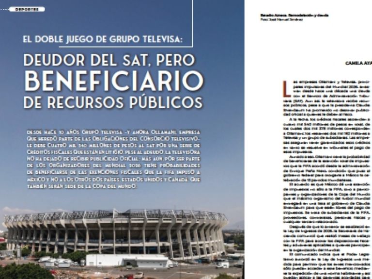 Y en Deportes los lectores encontrarán el reportaje sobre la doble ganancia que se perfila para Grupo Televisa y su subsidiaria Ollamani, empresa que administra el Estadio Azteca. Además de los recursos federales que el grupo ha obtenido vía la publicidad oficial, en medio de dos litigios por presuntos créditos fiscales, ambas firmas podrían verse beneficiadas con la exención de impuestos para 2026, como resultado del acuerdo que México hizo con la FIFA para la realización del Mundial de Futbol. Estados Unidos y Canadá, las otras dos sedes del torneo, no ofrecieron un arreglo similar con los dueños del espectáculo mundialista.