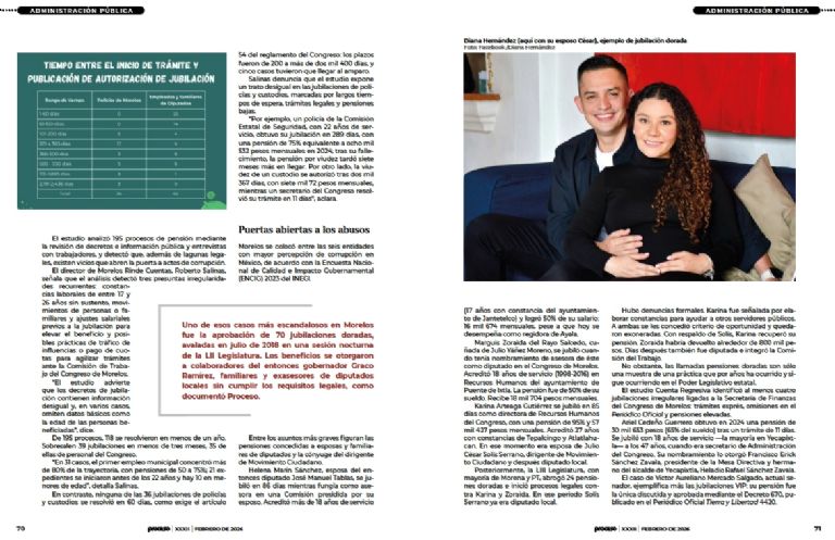 Otro ejemplo es de Anahí Bahena López, ella se jubiló en agosto de 2018, a los 37 años, como directora general de Consultoría en Asuntos Administrativos del Poder Ejecutivo, cargo que ocupó 19 meses; su trámite se resolvió en 41 días, cuando su esposo, Ángel Colín, era secretario de Gobierno de Graco Ramírez. Para acreditar 20 años de servicio reportó un empleo en el ayuntamiento de Ayala iniciado en 1998, cuando tenía 16 años, y obtuvo una jubilación de 60% de su salario: 42 mil 704 pesos mensuales. En noviembre de 2023 Bahena fue designada magistrada del Tribunal Superior de Justicia, con un sueldo neto de 100 mil pesos. La reforma judicial podría permitirle un retiro anticipado con haber vitalicio del mismo monto. Ella ahora tiene 44 años.